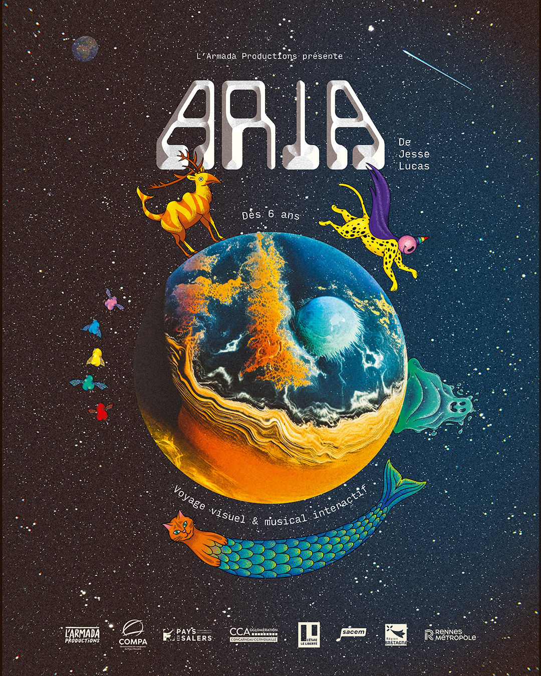 Ce spectacle est une odyssée spatiale à la recherche de la planète Aria, où le public interagit avec les écosystèmes des autres planètes rencontrés. C’est une très belle exploration poétique et ludique de notre propre environnement.