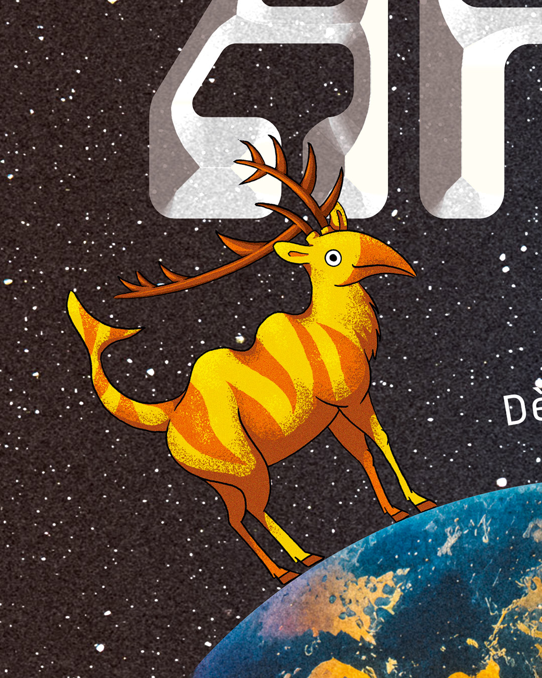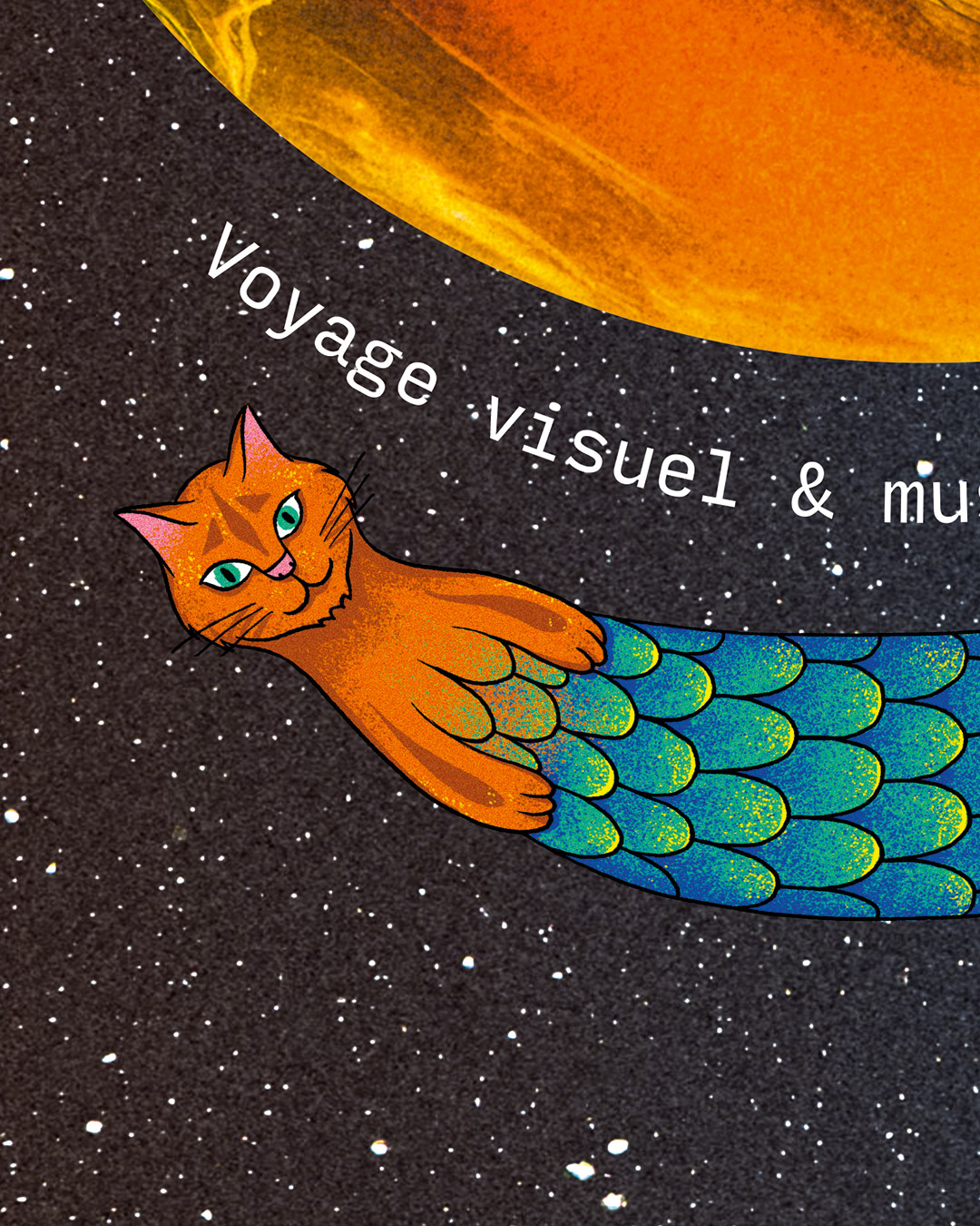 La typographie est tout droit sortie d’une interface informatique type Atari TOS, fidèle à l’univers graphique de navigation assumé du spectacle. Je gardais aussi dans un coin de ma tête les vaisseaux spatiaux blancs des productions de science fiction télévisées comme type Star Trek ou encore V.
