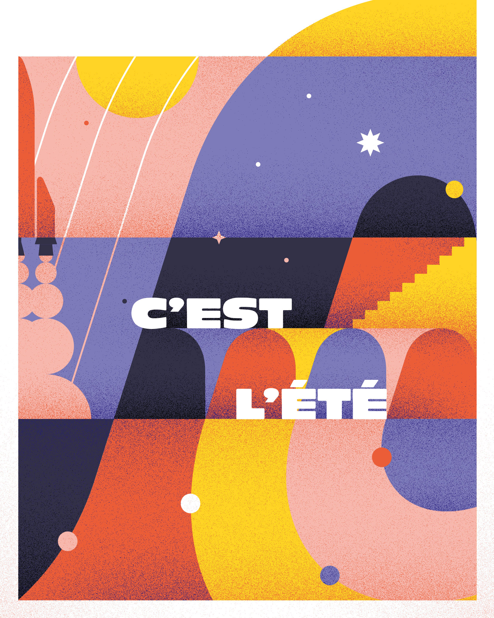 Illustration géométrique sobre, entre figuration et abstraction, réalisée pour le programme estival de l’Espace des sciences.